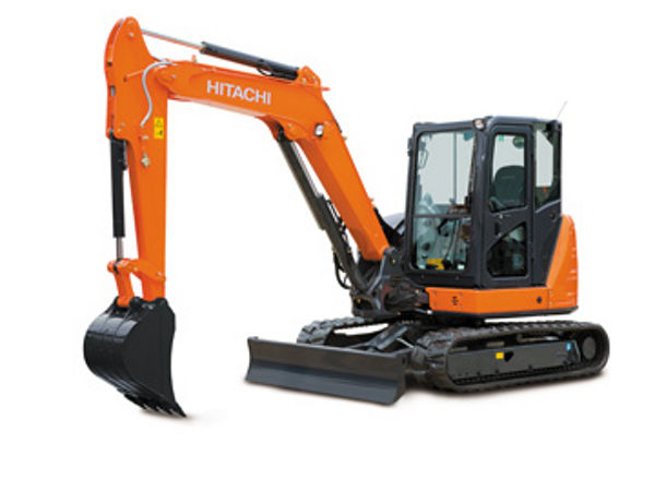 Máy đào bánh xích Mini Hitachi ZX65USB-5A, trọng lượng 6,17 - 6,6 tấn, công suất động cơ 34,1 kW, dung tích gầu 0,21 khối.